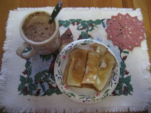 Sometimes the back yard at my folks would be a sheet of ice. We would use the back yard as our own private skating rink. After we would come in from the cold – one of our favorite treats was buttered toast with cocoa. We would make little “soldiers” (strips) out of toast and dip them in the cocoa. It is delicious! If you haven’t tried it – you should. It is delicious!