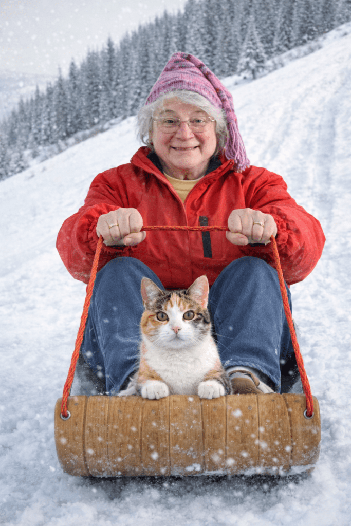 Growing up, my mother knitted not only our lovely Christmas stockings, but also our mittens and hats. I loved our “tukes.” That what we called our long v-shaped hats with a tassel on the end. The name may have come from tuque or toque hats. I just know we always called them “tukes.” About 10 years ago (a guess), I asked my mom if she would knit me one for my Christmas present or birthday present (my birthday is 12/26). She needed a pattern since she hadn’t made one is decades. I found a “toboggan hat” that looked like one. It wasn’t as long, but it was long enough. 🙂 Today, I put on the hat and my winter jacket in my living room. I set up my iPhone to take photo with a 10 second timer. It gave me long enough to sit in my rocking chair with my legs on the hassock. I was trying to look like I was in a toboggan. I then recreated the image above using ChatGPT. I haven’t been on a sled, saucer, or toboggan for quite a few years … but Never say Never! I amused myself with the creation and added my calico Maisey along for a ride. At least, I didn’t have to walk back up the hill!